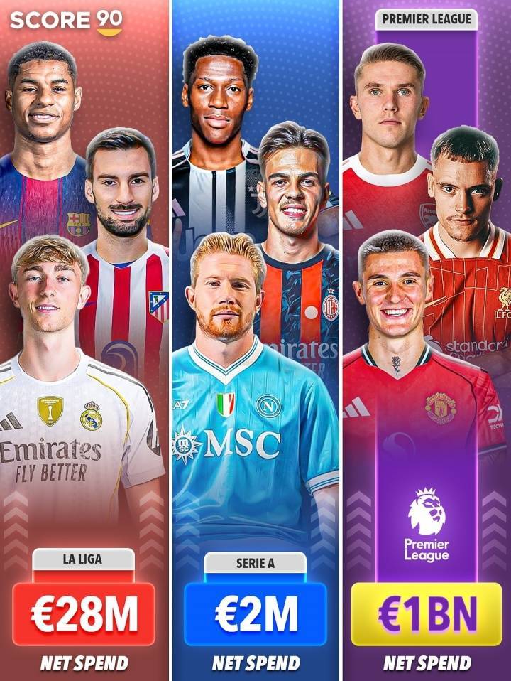 直播吧08月12日讯 外媒SCORE90统计了欧洲四大联赛在夏季转会窗的收支情况,英超以10亿欧元的净支出遥遥领先,西甲净支出2800万欧元,意甲200万欧元,德甲则在转会市场上净赚1.4亿欧元。