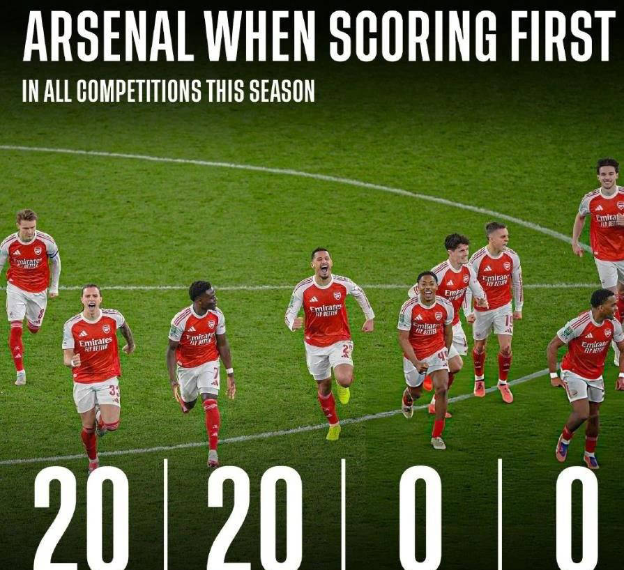 截止目前,阿森纳在本赛季各项赛事共参与了20场比赛,每一次当他们成为率先进球的一方,最终全数拿下比赛胜利,没有一场例外。例如英超首轮客场1-0险胜曼联,接着第二轮5-0横扫利兹联、第四轮2-0击败诺丁汉森林;欧冠小组第一轮客场2-0力克毕尔巴鄂竞技等战绩皆体现了这一规律。而且这20场比赛涵盖了多个不同赛场,包括英超、欧冠以及英联杯,证明了阿森纳在多线作战中的稳定表现。